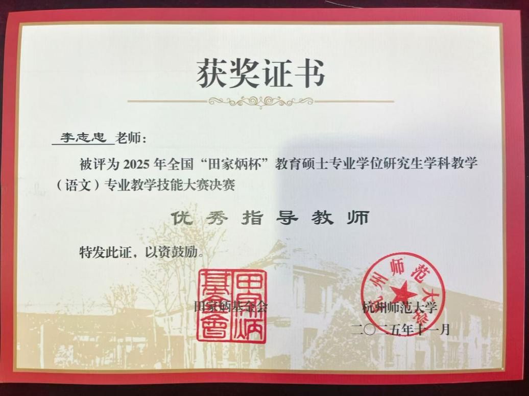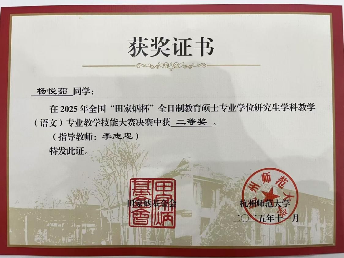 2025年全国“田家炳杯”全日制教育硕士专业学位研究生学科教学(语文)专业教学技能大赛决赛于11月8日在杭州师范大学举行。永利官网2024级学科教学(语文)专业研究生杨悦茹荣获二等奖,李志忠荣获“优秀指导教师”。