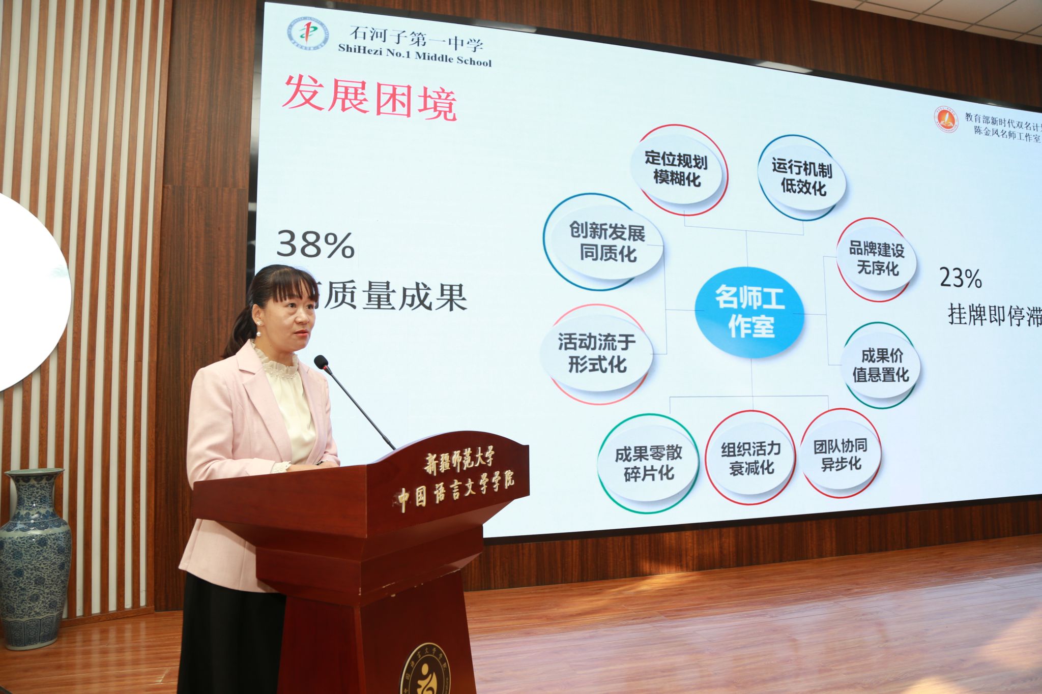 天山英才教学名师、克拉玛依一中正高级教师孙玉红围绕“用行动研究发现工作室专业提升有效路径”进行主旨发言。教育部新时代双名计划名师、石河子一中正高级陈金凤老师聚焦名师工作室面临的发展瓶颈问题,分享了在名师工作室的宝贵经验,提出通过实施三课体制、加强协同联动以及开展送教帮扶等策略,助力教师实现从经验型向研究型的蜕变。与会的其他12位教学名师工作室主持人也进行了精彩的发言。论坛期间,还进行了新疆语文教学名师教学成果展示活动。