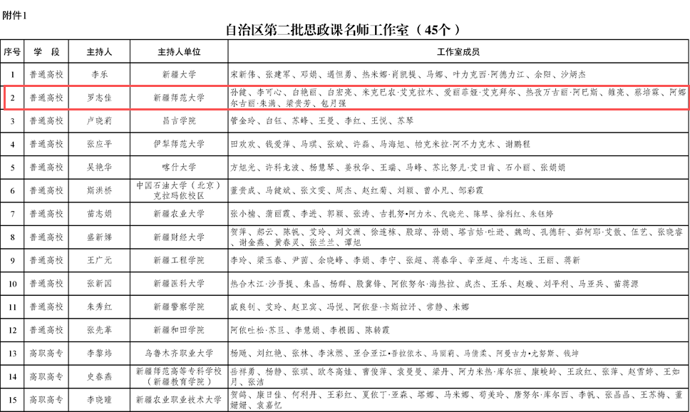近日,自治区教育厅下发《关于第二批思政课名师工作室、第二批高校辅导员名师工作室和首批心理健康教育名师工作室评选结果的公示》,永利官网马克思主义学院副院长罗志佳教授主持的思政课名师工作室入选自治区第二批思政课名师工作室公示名单。该工作室名为“智慧思政课名师工作室”,成员由来自华东师范大学、yl6809永利官网、新疆科技学院、博州职业技术学院、塔城地委党校等多家单位的教学骨干组成,聚焦高校思政课特别是《习近平新时代中国特色社会主义思想概论》课程的智慧教学改革与探索,致力于打造跨学科、跨校、跨区域的思政课智慧教学共同体。
