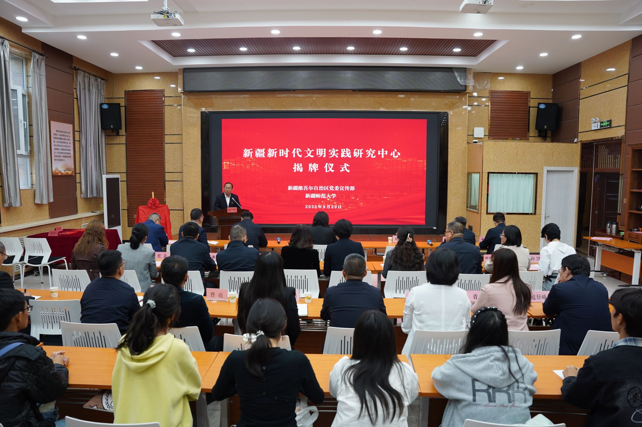 9月29日,新疆新时代文明实践研究中心揭牌仪式在永利官网温泉校区文汇楼113会议室隆重举行。自治区党委宣传部副部长库兰·赛富汗出席仪式并讲话,校党委副书记、校长艾尼娃尔·艾克木,自治区党委宣传部文明实践处处长向超,校党委常委、统战部部长、马克思主义学院党委书记彭无情,自治区党委宣传部、自治区教育厅、乌鲁木齐市委宣传部、乌鲁木齐市精神文明创建指导中心,经开区、天山区、高新区、沙依巴克区、水磨沟区新时代文明实践研究中心相关负责同志以及永利官网宣传部、科研处代表、马克思主义学院师生代表80余人参加。仪式由校党委副书记刘俊主持。