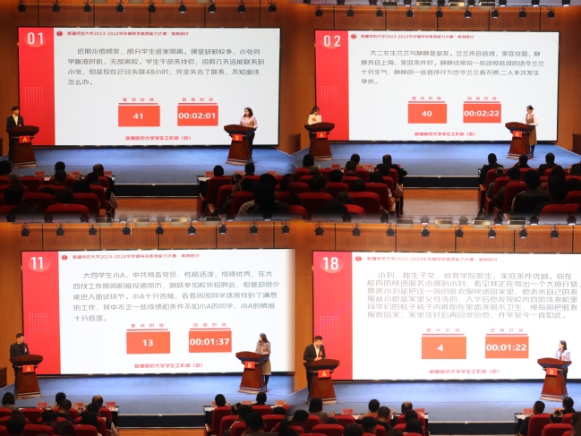 比赛对标“全国高校辅导员素质能力大赛”标准,经过前期基础知识测试(笔试),18名辅导员成功晋级决赛。决赛分为案例研讨和谈心谈话两个环节。案例研讨环节,辅导员通过抽签两两成组,现场抽题,以“我提问,你回答”的方式围绕案例共同辨析原因、研讨对策,展示了辅导员分析、研判、解决问题和处理问题的能力。