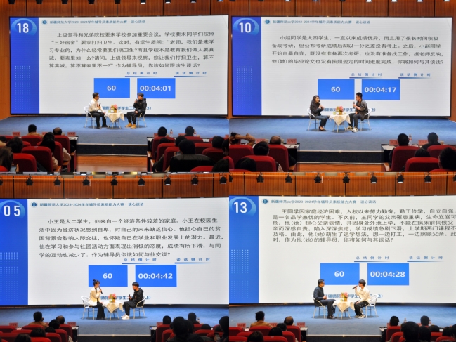 谈心谈话环节,辅导员现场抽题并随机匹配助演学生,以情景再现的方式就学生学习生活、评奖评优、就业创业、个人情感、心理问题、大学规划等一系列相关问题展开谈话,考验了辅导员对学生特征、成长成才规律的了解和把握程度,以及对学生的教育引导能力、解决理论困惑和实际问题的能力等。