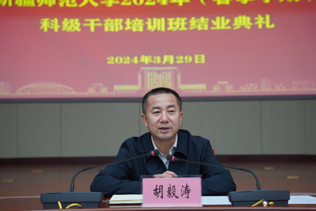 胡毅涛在结业典礼上作总结发言并为优秀学员颁发荣誉证书。他强调,各位学员要通过学习,把党的科学理论与实际工作结合起来,努力实现学习成果最大化,做到融会贯通、学以致用,真正把所学所获转化为补短板、强弱项、求突破的能力和水平,努力为学校高质量发展,建设一流师范贡献自己的智慧和力量。
