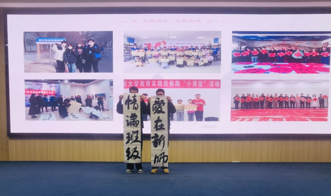班长代表们在分享环节向与会师生介绍了“三强班级”创建经验。历史与社会学院历史学22-1班围绕文化认同介绍“中国古代服饰之美”“古钱穿越”等文化润人创建活动;国际文化交流学院汉语国际教育21-1班在学风建设上下功夫,强调“要结合专业创三强”的要领,如中文俄文书法“日日练”等;计算机科学技术学院软件工程21-6班介绍了班级公约、班委角色定位、班级帮扶学习互助模式以及学生个人成长赋分制度与创建“三强三好”的关系;美术学院书法学22-11班介绍了班徽、结合书法专业开展社会服务和校内实践的生动案例,向现场赠送自制书签,并现场书写“情满班级,爱在新师”,赢得了满堂喝彩。