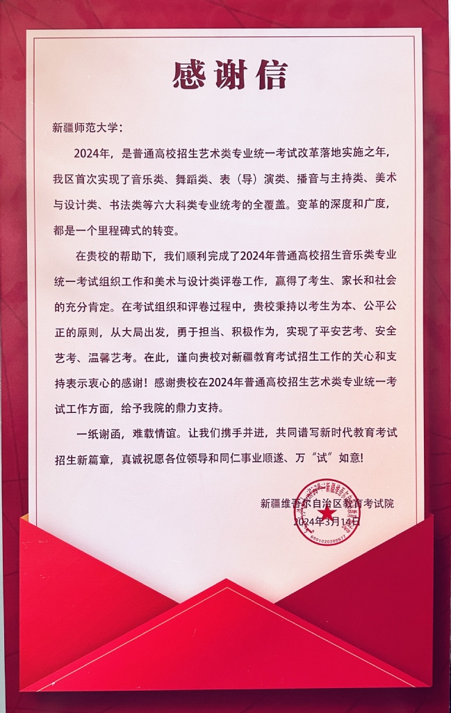 近日,永利官网在自治区2024年普通高校招生艺术类专业统一考试总结会上,收到来自新疆维吾尔自治区教育考试院的感谢信,对永利官网在2024年普通高校招生音乐类专业统一考试组织工作和美术与设计类评卷工作过程中给予的大力支持表示感谢。