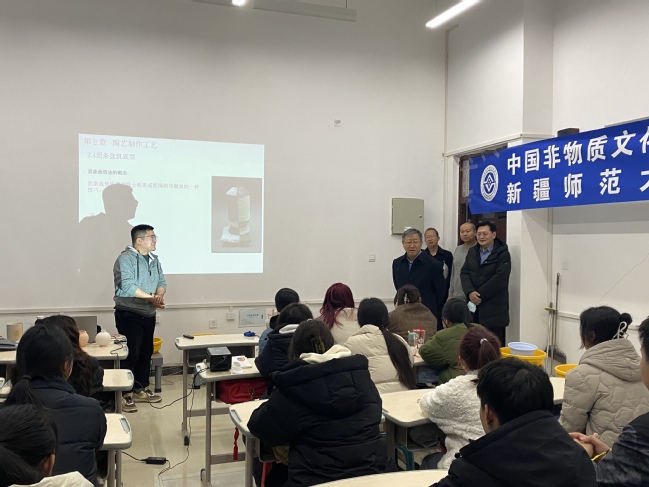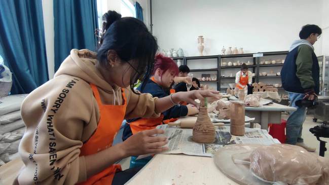 本期《陶艺》训练营由美术学院教师新疆工艺美术大师张国靖、陶艺家马云翔担任指导教师。来自文物与博物馆学、思想政治教育、马克思主义理论、民族学、宗教学等专业的30名非艺术类专业学生选修本期课程。在陶艺课上,同学们不仅可以了解陶土制作的相关知识,扩展艺术视野,还能通过亲手“敲打、揉搓、拉、团”体验“玩泥巴”拉胚的乐趣,学习热情高涨。