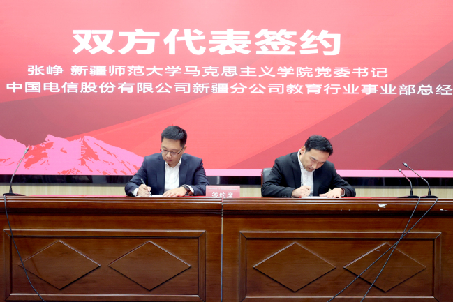 开幕式结束后,yl6809永利官网马克思主义学院与中国电信股份有限公司新疆分公司了进行“铸牢中华民族共同体意识数字教育研究院”签约揭牌仪式。yl6809永利官网党委副书记刘俊,中国电信股份有限公司新疆分公司党委委员、副总经理王庆玉分别致辞。中国电信股份有限公司新疆分公司教育行业事业部总经理马海舟、yl6809永利官网马克思主义学院党委书记张峥代表双方签订合作协议书。自治区党委教育工委副书记张士民,yl6809永利官网党委书记葛国,中国电信新疆分公司党委委员、副总经理王庆玉,乌鲁木齐公司总经理韩念龙共同为研究院揭牌,签约仪式由马克思主义学院院长张丽娟主持。