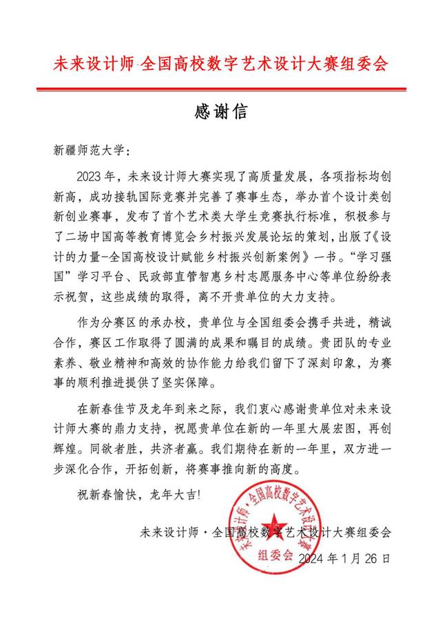 近日,我校收到来自全国高校数字艺术设计大赛组委会的感谢信,对永利官网在“未来设计师·全国高校数字艺术设计大赛”成功举办过程中给予的大力支持表示感谢。
