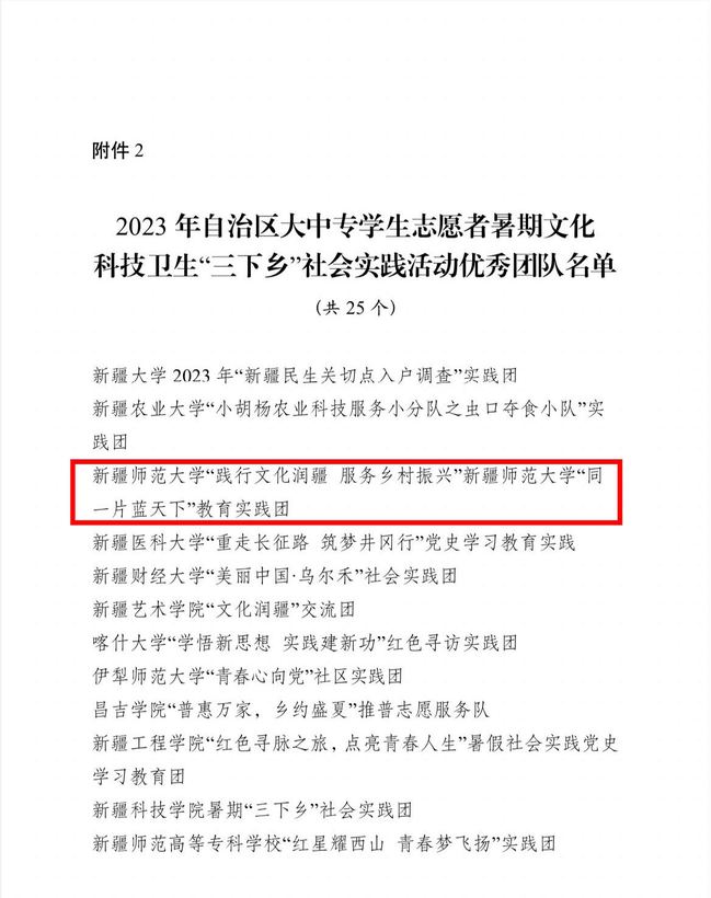 近日,自治区团委公布了《2023年自治区大中专学生志愿者暑期文化科技卫生“三下乡”社会实践活动总结通报结果》,对活动中表现突出的优秀单位、团队和个人进行通报表扬。其中,永利官网团委荣获优秀单位,“践行文化润疆服务乡村振兴”yl6809永利官网“同一片蓝天下”教育实践团荣获优秀团队,校团委办公室主任汪艳霞、马克思主义学院马克思主义中国化研究专业2023级硕士研究生张子帆荣获优秀个人。