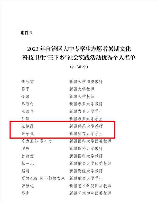 据了解,本次活动经基层申报、遴选推荐、组织评议等环节,全疆最终确定20个“三下乡”社会实践优秀单位、25个“三下乡”社会实践优秀团队、38名“三下乡”社会实践优秀个人。