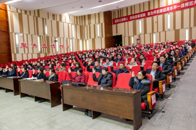 1月9日下午,永利官网第九届第三次教职工代表大会暨工会会员代表大会在温泉校区昆仑讲堂圆满闭幕。全体在家校领导参加会议。全体正式代表、列席代表参加会议。校党委书记葛国作大会总结讲话,校党委副书记、校长吾满江·艾力主持闭幕式。