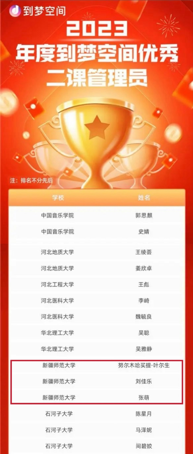 近日,2023年度到梦空间“优秀二课管理员”评选活动进行公示,经个人申报,高校团委评选推荐,到梦空间系统运营中心评议组评审、复核、审定,在全国入驻高校提交的573份评选材料中共评选出192位年度到梦空间“优秀二课管理员”,永利官网计算机科学技术学院努尔木哈买提·叶尔生、政法学院张萌、商学院刘佳乐获评2023年度到梦空间“优秀二课管理员”,居参评高校前列。