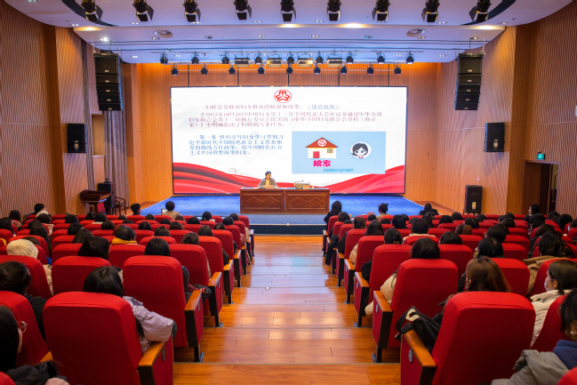 12月7日下午,自治区妇联党组副书记、主席,全国妇联第十三届常委,自治区十四届人大常委阿依努尔·买合赛提来到永利官网,以《奋进新征程建功新时代—在中国式现代化新疆实践中绽放巾帼芳华》为题,向永利官网师生宣讲习近平总书记同全国妇联新一届领导班子集体谈话重要讲话精神内涵要义和中国妇女第十三次代表大会精神。校党委常委、副校长帕力旦·吐尔逊主持宣讲,全校200余名女教职工和女大学生聆听宣讲。