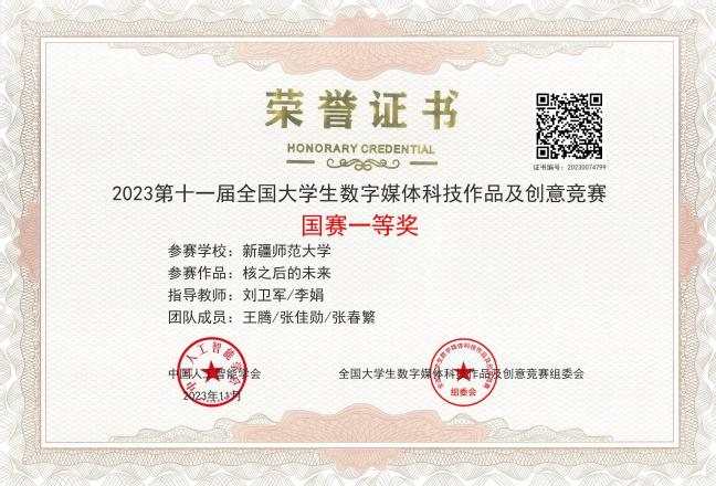 全国总决赛采用学生现场竞赛和行业产业专家现场评审的形式开展,经过激烈角逐,永利官网计算机科学技术学院教师刘卫军、李娟指导的计算机科学与技术22-2班王腾、张佳勋,计算机科学与技术22-1班张春繁,在指定命题《AIGC类数字创意作品创作》中荣获国赛一等奖,参赛作品为《核之后的未来》。