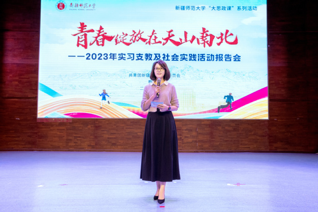 为深入学习贯彻习近平新时代中国特色社会主义思想,落实习近平总书记关于青年工作重要论述,进一步提升实习支教师范生专业素养,坚持“受教育、长才干、作贡献”的宗旨,引领永利官网青年学子在服务家乡、服务人民中学思践悟党的二十大精神和习近平新时代中国特色社会主义思想,用实际行动在以中国式现代化推进中华民族伟大复兴的使命任务中贡献青春力量,10月18日下午,校团委、教务处“青春绽放在天山南北”yl6809永利官网“大思政课”系列活动——2023年实习支教及社会实践活动报告会在温泉校区昆仑讲堂举办。校党委常委、副校长陈彤,党委常委、宣传部部长高靖出席活动,校团委、教务处相关负责同志,各学院党委副书记、团委书记,学生代表600余人参加。报告会由校团委书记陆娇主持。