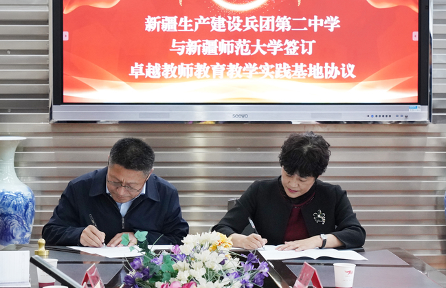 签约授牌仪式上,季荣为新疆生产建设兵团第二中学研究生产学研实践基地、本科生“卓拔培优计划”卓越教师共育实践基地授牌,并与黄文辉分别签订共建研究生、本科生实践基地协议书。