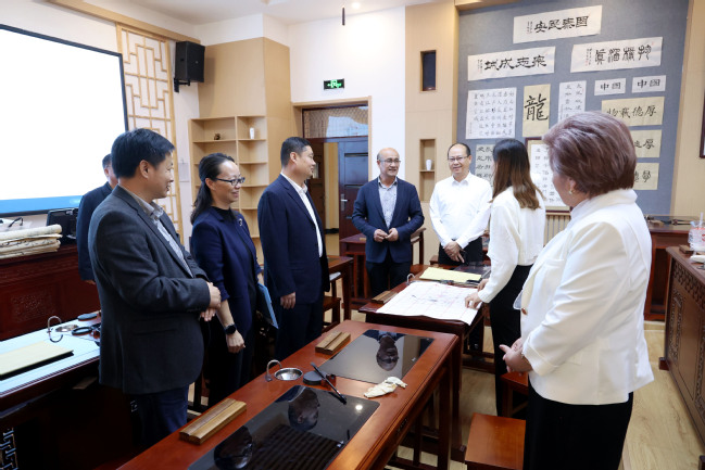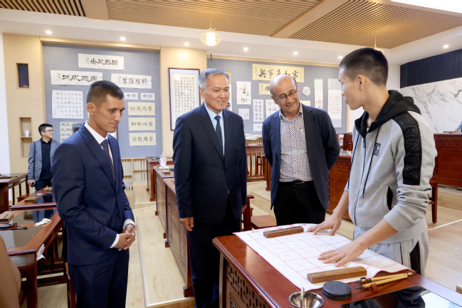 交流期间,库班内齐·托克托洛夫一行实地参观了中华文化体验中心、图书馆并与在场的中外学生亲切交流。在图书馆,吾满江·艾力代表学校给各位外宾赠送书籍。