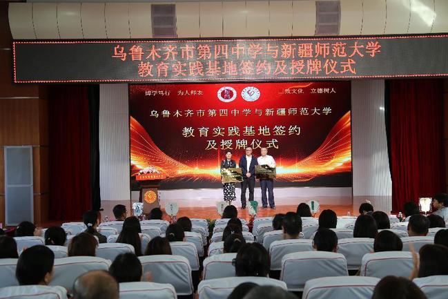 校党委常委、副校长陈彤向乌鲁木齐市第四中学颁发教育实践基地牌匾