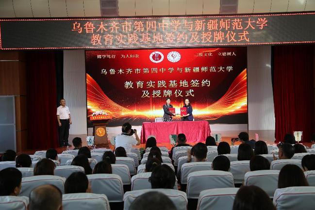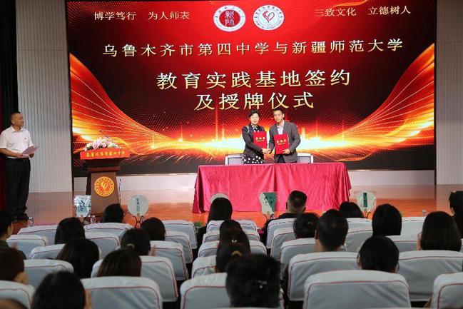 签约授牌仪式上,研究生处处长周珊、教务处副处长毋兆鹏分别与乌鲁木齐市第四中学党总支书记付传姝签订实践基地协议。