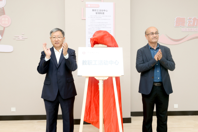 校党委书记葛国和校党委副书记、校长吾满江·艾力为教职工活动中心揭牌