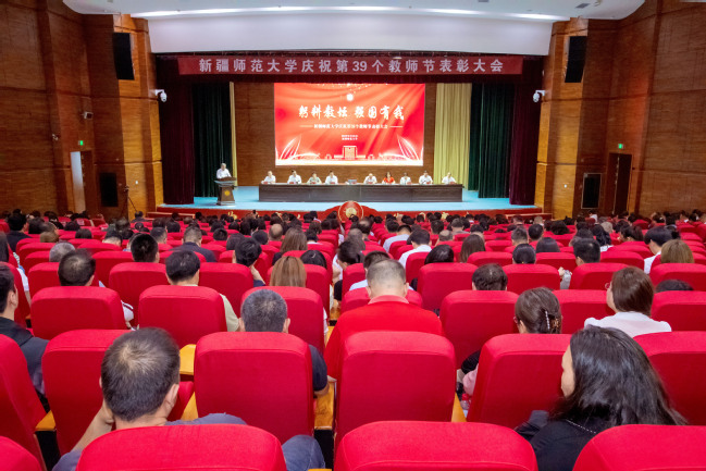 9月8日下午,永利官网庆祝第39个教师节表彰大会在温泉校区昆仑讲堂隆重召开。全体在家校领导出席表彰大会,会议由校党委副书记、校长吾满江·艾力主持。受表彰教职工代表,各学院、机关教辅部门教师代表,2023年新进教职工近600人参加大会。