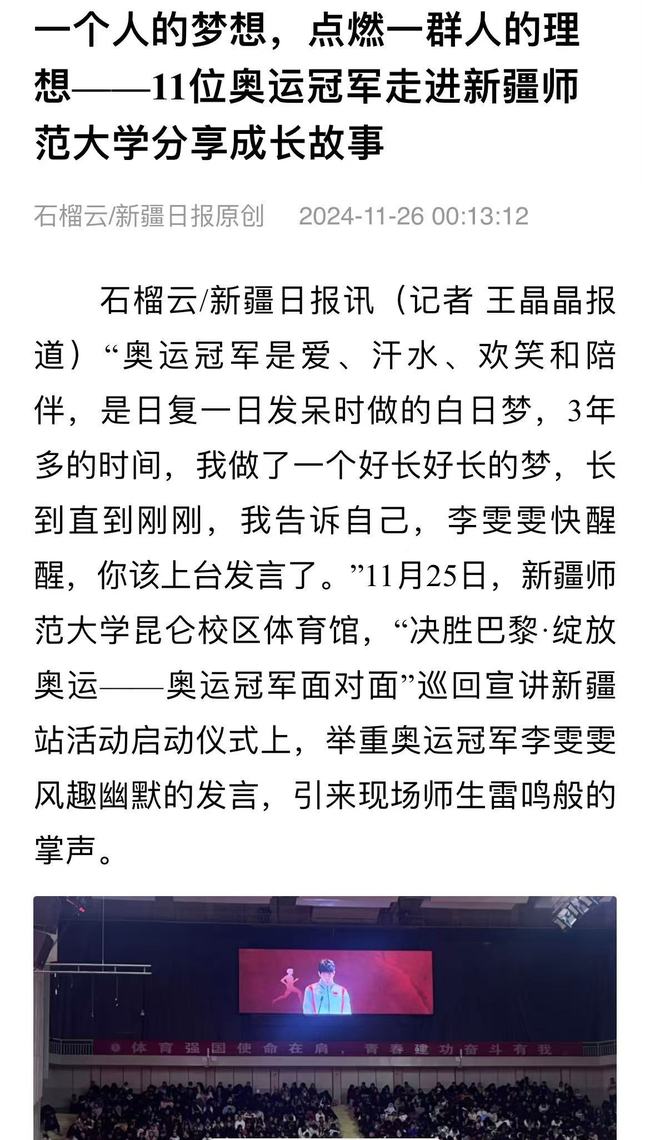 石榴云/新疆日报讯(记者 王晶晶报道)“奥运冠军是爱、汗水、欢笑和陪伴,是日复一日发呆时做的白日梦,3年多的时间,我做了一个好长好长的梦,长到直到刚刚,我告诉自己,李雯雯快醒醒,你该上台发言了。”11月25日,yl6809永利官网昆仑校区体育馆,“决胜巴黎·绽放奥运——奥运冠军面对面”巡回宣讲新疆站活动启动仪式上,举重奥运冠军李雯雯风趣幽默的发言,引来现场师生雷鸣般的掌声。