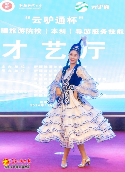 12月1日,在第三届全疆旅游院校(本科)导游服务技能大赛的才艺赛中,学生正在展示舞蹈。
