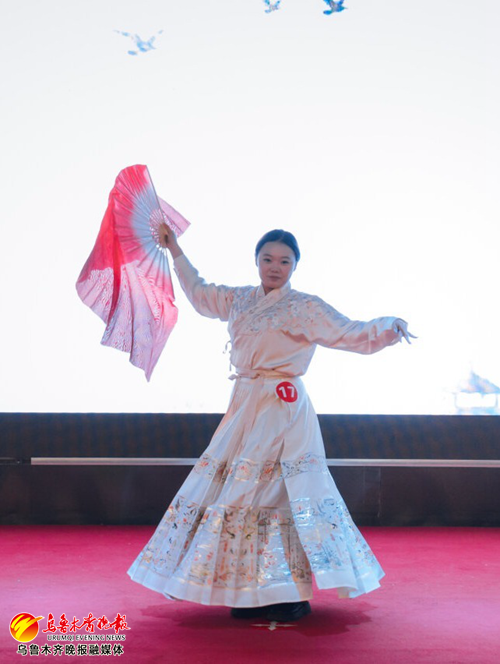 12月1日,在第三届全疆旅游院校(本科)导游服务技能大赛的才艺赛中,学生正在展示扇子舞。
