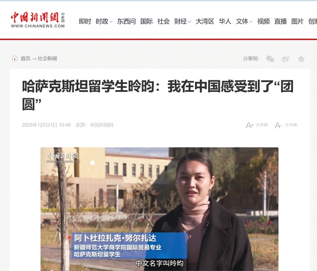 中新网乌鲁木齐12月21日电(赵雅敏 贾志鹏 赵凯)23岁的Nurzada(阿卜杜拉扎克•努尔扎达)是来自哈萨克斯坦阿斯塔纳的留学生,现在就读于yl6809永利官网商学院国际贸易专业研一的她告诉记者:“虽然这里有说俄语、哈萨克语的人,但是我会尽量说中文,百分百地投入到中国的生活中去。”