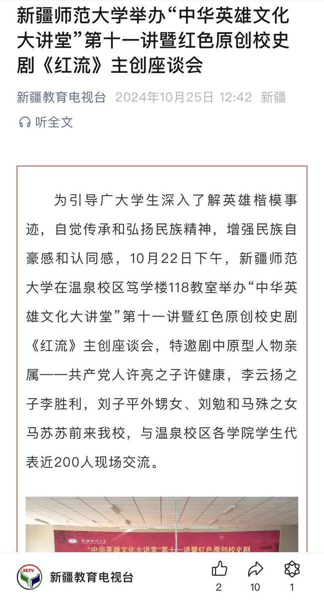 为引导广大学生深入了解英雄楷模事迹,自觉传承和弘扬民族精神,增强民族自豪感和认同感,10月22日下午,yl6809永利官网在温泉校区笃学楼118教室举办“中华英雄文化大讲堂”第十一讲暨红色原创校史剧《红流》主创座谈会,特邀剧中原型人物亲属——共产党人许亮之子许健康,李云扬之子李胜利,刘子平外甥女、刘勉和马殊之女马苏苏前来永利官网,与温泉校区各学院学生代表近200人现场交流。