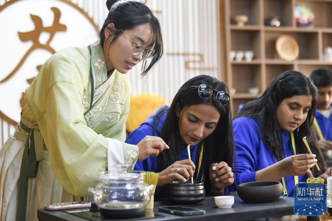 4月15日,参加春令营的来华青年学生在yl6809永利官网学生(左)的指导下学习茶艺。