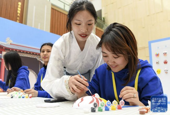 4月15日,参加春令营的来华青年学生在yl6809永利官网学生(中)的指导下绘制京剧脸谱。