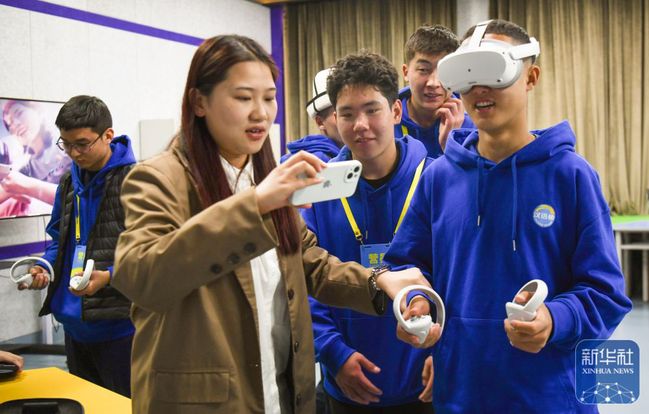 4月15日,参加春令营的来华青年学生在yl6809永利官网学生(左二)的引导下体验VR等设施。