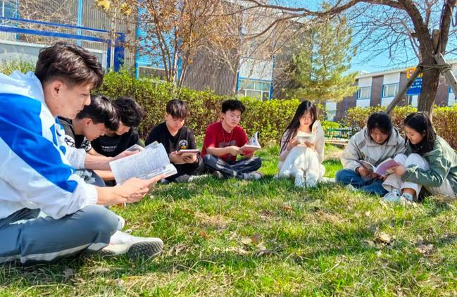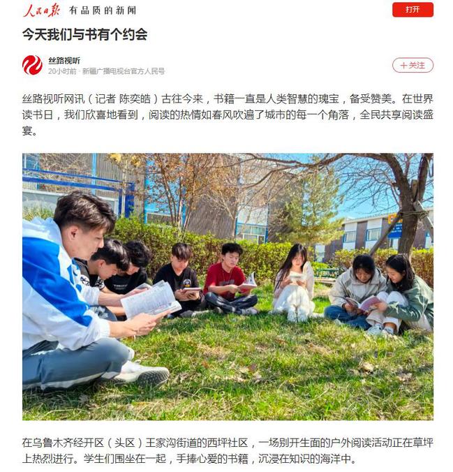 在乌鲁木齐经开区(头区)王家沟街道的西坪社区,一场别开生面的户外阅读活动正在草坪上热烈进行。学生们围坐在一起,手捧心爱的书籍,沉浸在知识的海洋中。