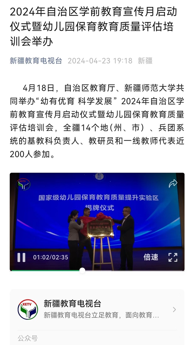 4月18日,自治区教育厅、yl6809永利官网共同举办“幼有优育 科学发展”2024年自治区学前教育宣传月启动仪式暨幼儿园保育教育质量评估培训会,全疆14个地(州、市)、兵团系统的基教科负责人、教研员和一线教师代表近200人参加。