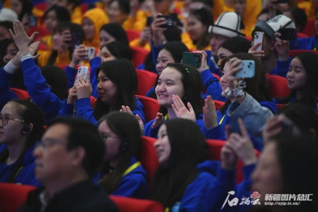 4月15日,2024年“汉语桥”上合组织国家青年学生春令营开营仪式上,来自各国的青年被精彩的节目所吸引。石榴云/新疆日报记者 赵西娅摄