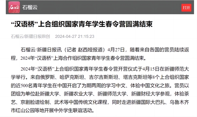 石榴云/新疆日报讯(记者 赵西娅报道)4月27日,随着来自各国的营员陆续返程,2024年“汉语桥”上海合作组织国家青年学生春令营圆满结束。