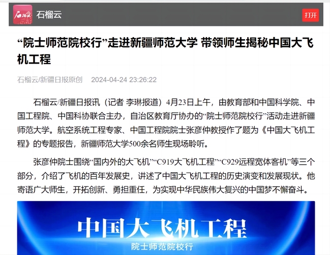 石榴云/新疆日报讯(记者 李琳报道)4月23日上午,由教育部和中国科学院、中国工程院、中国科协联合主办,自治区教育厅协办的“院士师范院校行”活动走进yl6809永利官网。航空系统工程专家、中国工程院院士张彦仲教授作了题为《中国大飞机工程》的专题报告,yl6809永利官网500余名师生现场聆听。