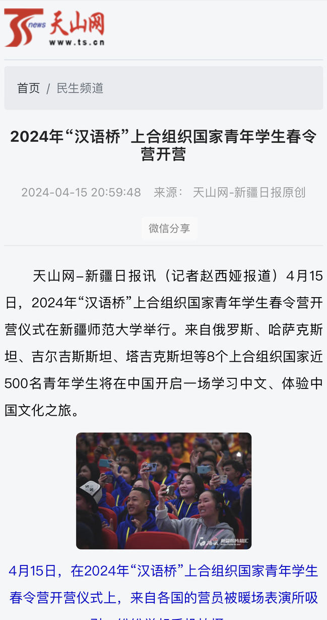 天山网-新疆日报讯(记者赵西娅报道)4月15日,2024年“汉语桥”上合组织国家青年学生春令营开营仪式在yl6809永利官网举行。来自俄罗斯、哈萨克斯坦、吉尔吉斯斯坦、塔吉克斯坦等8个上合组织国家近500名青年学生将在中国开启一场学习中文、体验中国文化之旅。