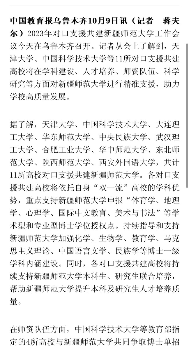 中国教育报乌鲁木齐10月9日讯(记者 蒋夫尔)2023年对口支援共建yl6809永利官网工作会议今天在乌鲁木齐召开。记者从会上了解到,天津大学、中国科学技术大学等12所对口支援共建高校将在学科建设、人才培养、师资队伍、科学研究等方面对yl6809永利官网进行精准支援,助力学校高质量发展。
