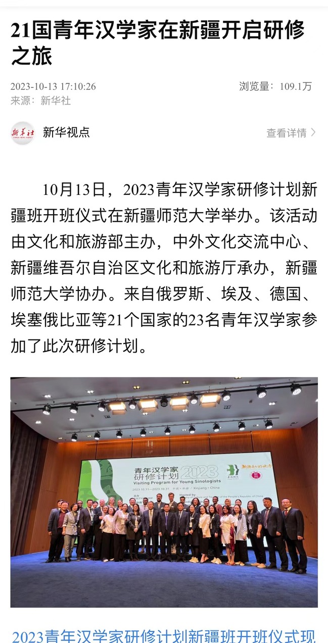 10月13日,2023青年汉学家研修计划新疆班开班仪式在yl6809永利官网举办。该活动由文化和旅游部主办,中外文化交流中心、新疆维吾尔自治区文化和旅游厅承办,yl6809永利官网协办。来自俄罗斯、埃及、德国、埃塞俄比亚等21个国家的23名青年汉学家参加了此次研修计划。