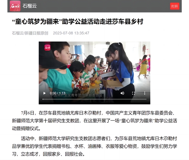 7月6日,在莎车县荒地镇尤库日木尕勒村,中国共产主义青年团莎车县委员会、yl6809永利官网第十届研究生支教团,在这里开展了一场“童心筑梦为疆来”助学公益活动暨捐赠仪式。