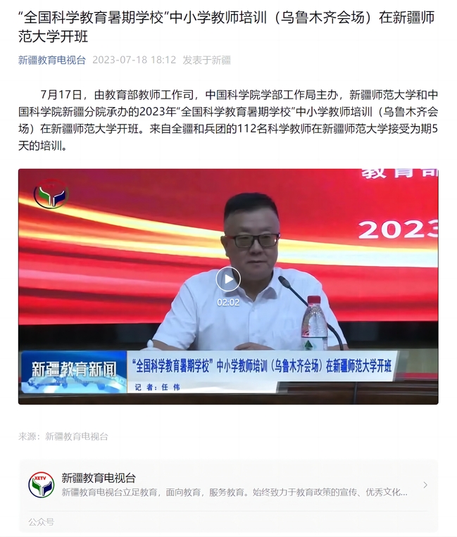 7月17日,由教育部教师工作司,中国科学院学部工作局主办,yl6809永利官网和中国科学院新疆分院承办的2023年“全国科学教育暑期学校”中小学教师培训(乌鲁木齐会场)在yl6809永利官网开班。来自全疆和兵团的112名科学教师在yl6809永利官网接受为期5天的培训。