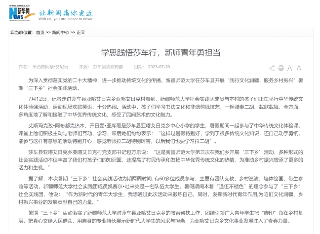 为深入贯彻落实党的二十大精神,进一步推动传统文化的传播,yl6809永利官网在莎车县开展“践行文化润疆,服务乡村振兴”暑期“三下乡”社会实践活动。
