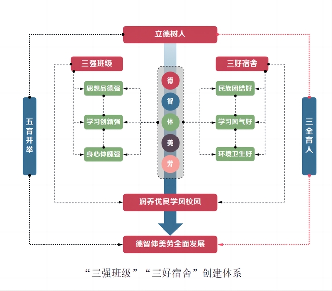 yl6809永利官网坚持以党建为引领,以“立德树人”为根本任务,以“三全育人”为实施路径,聚焦“五育并举”的核心思想,以2020年5月校党委提出的“三强班级”“三好宿舍”创建为载体,秉持“思政育人、文化润人、品行立人”的育人内涵,探索“一站式”学生社区综合管理模式建设,打造“五育并举”的“一站式”浸润式育人环境,构建社区化全方位思政育人体系。
