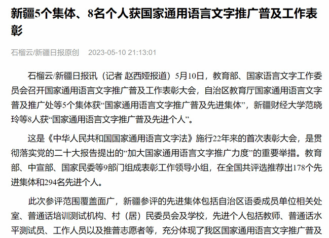 石榴云/新疆日报讯(记者 赵西娅报道)5月10日,教育部、国家语言文字工作委员会召开国家通用语言文字推广普及工作表彰大会,自治区教育厅国家通用语言文字普及推广处等5个集体获“国家通用语言文字推广普及先进集体”,新疆财经大学范晓玲等8人获“国家通用语言文字推广普及先进个人”。