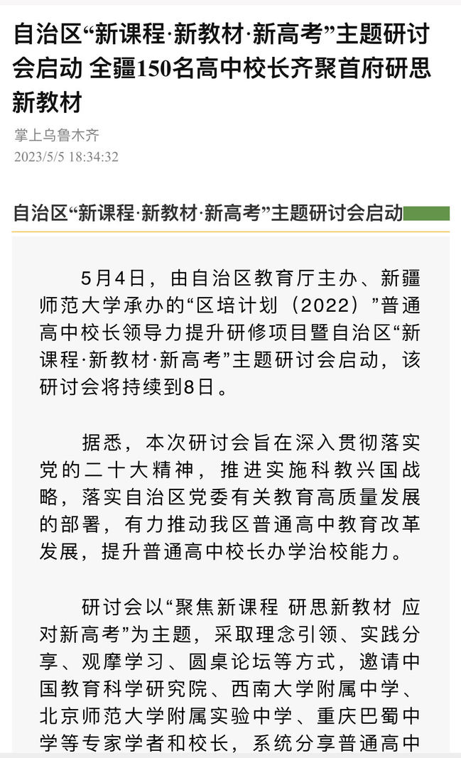 5月4日,由自治区教育厅主办、yl6809永利官网承办的“区培计划(2022)”普通高中校长领导力提升研修项目暨自治区“新课程·新教材·新高考”主题研讨会启动,该研讨会将持续到8日。
