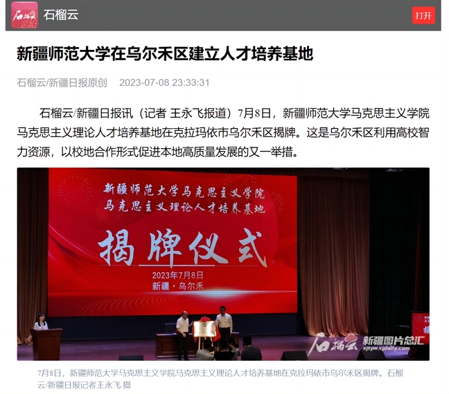 石榴云/新疆日报讯(记者 王永飞报道)7月8日,yl6809永利官网马克思主义学院马克思主义理论人才培养基地在克拉玛依市乌尔禾区揭牌。这是乌尔禾区利用高校智力资源,以校地合作形式促进本地高质量发展的又一举措。