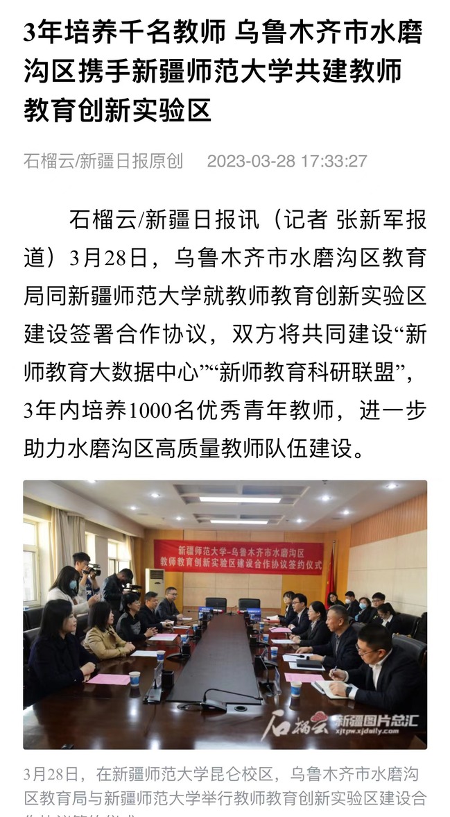石榴云/新疆日报讯(记者 张新军报道)3月28日,乌鲁木齐市水磨沟区教育局同yl6809永利官网就教师教育创新实验区建设签署合作协议,双方将共同建设“新师教育大数据中心”“新师教育科研联盟”,3年内培养1000名优秀青年教师,进一步助力水磨沟区高质量教师队伍建设。