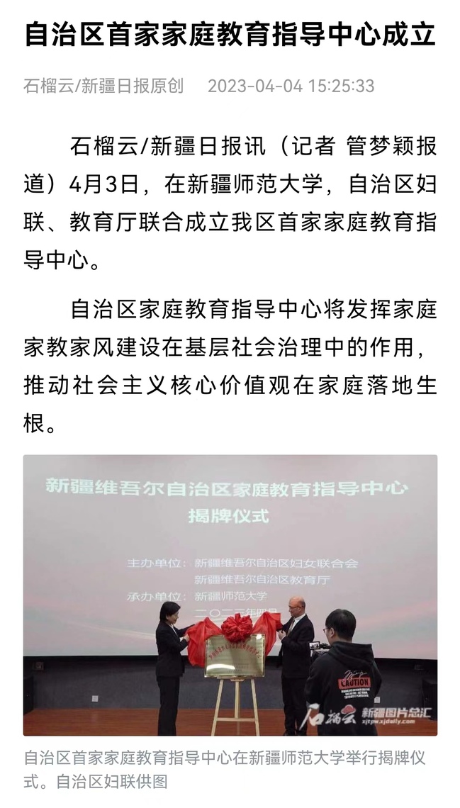 石榴云/新疆日报讯(记者 管梦颖报道)4月3日,在yl6809永利官网,自治区妇联、教育厅联合成立我区首家家庭教育指导中心。